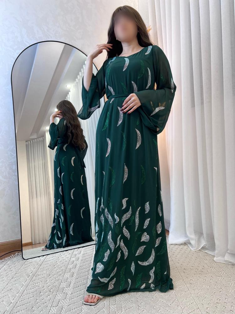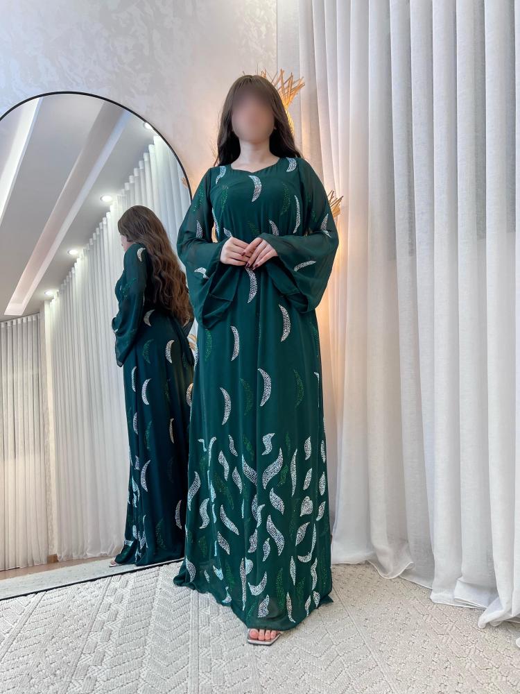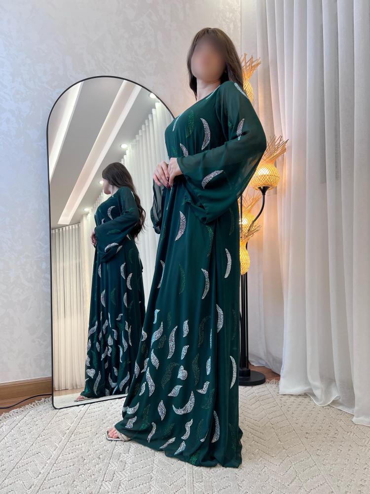 هذه الجلابية الأنيقة مصنوعة من قماش شيفون حرير يظهر نعومته وأناقة مظهره. الجلابية مزينه بفصوص سوارفكسي و بتطريز يدوي فخم تُضفي لمسة فخامة وتبرز جمال التصميم. مما يجعلها خياراً مثالياً للمناسبات الفاخرة.